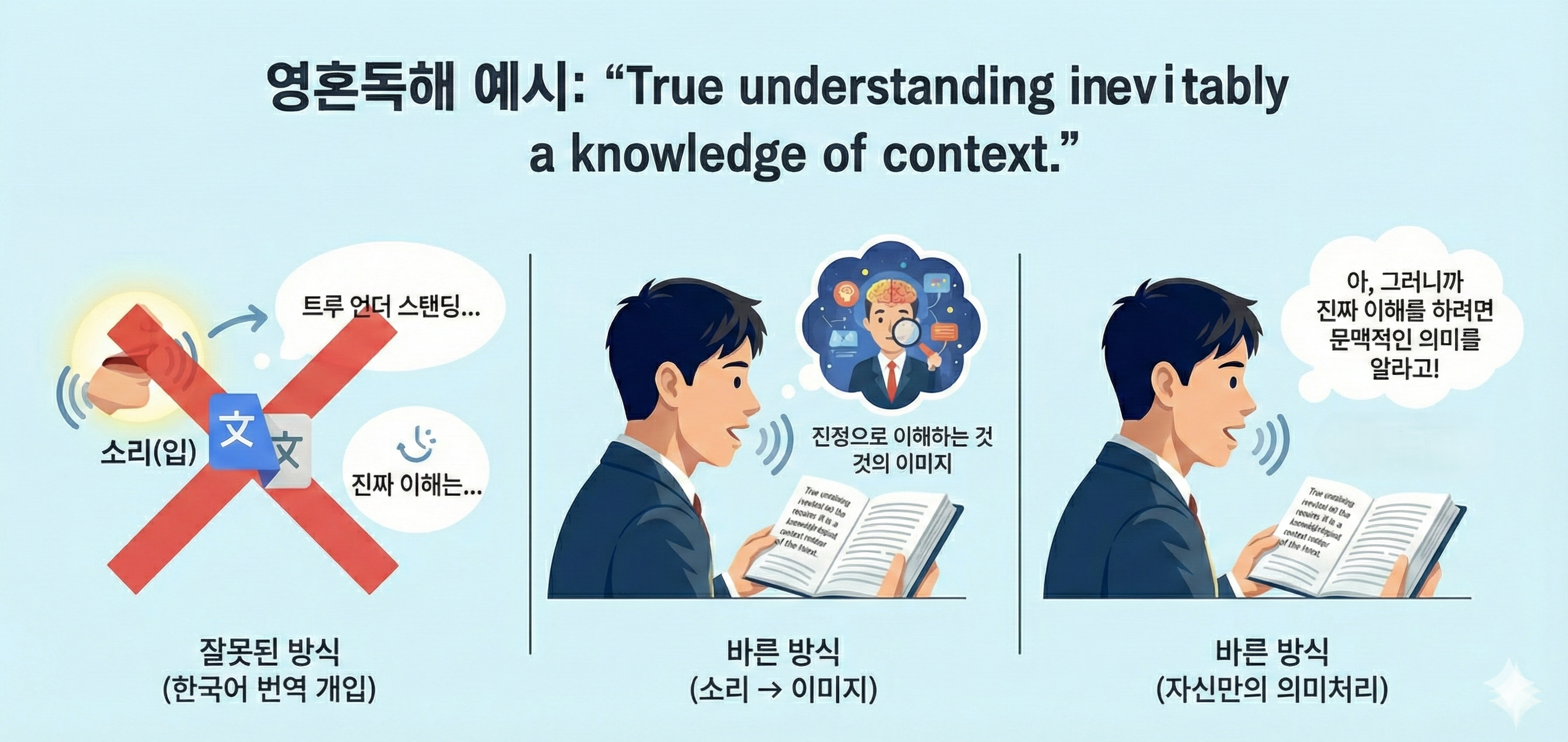 - 잘못된 방법: "트루 언더 스탠딩..." (발음) -> '진짜 이해는...' (우리말 번역)